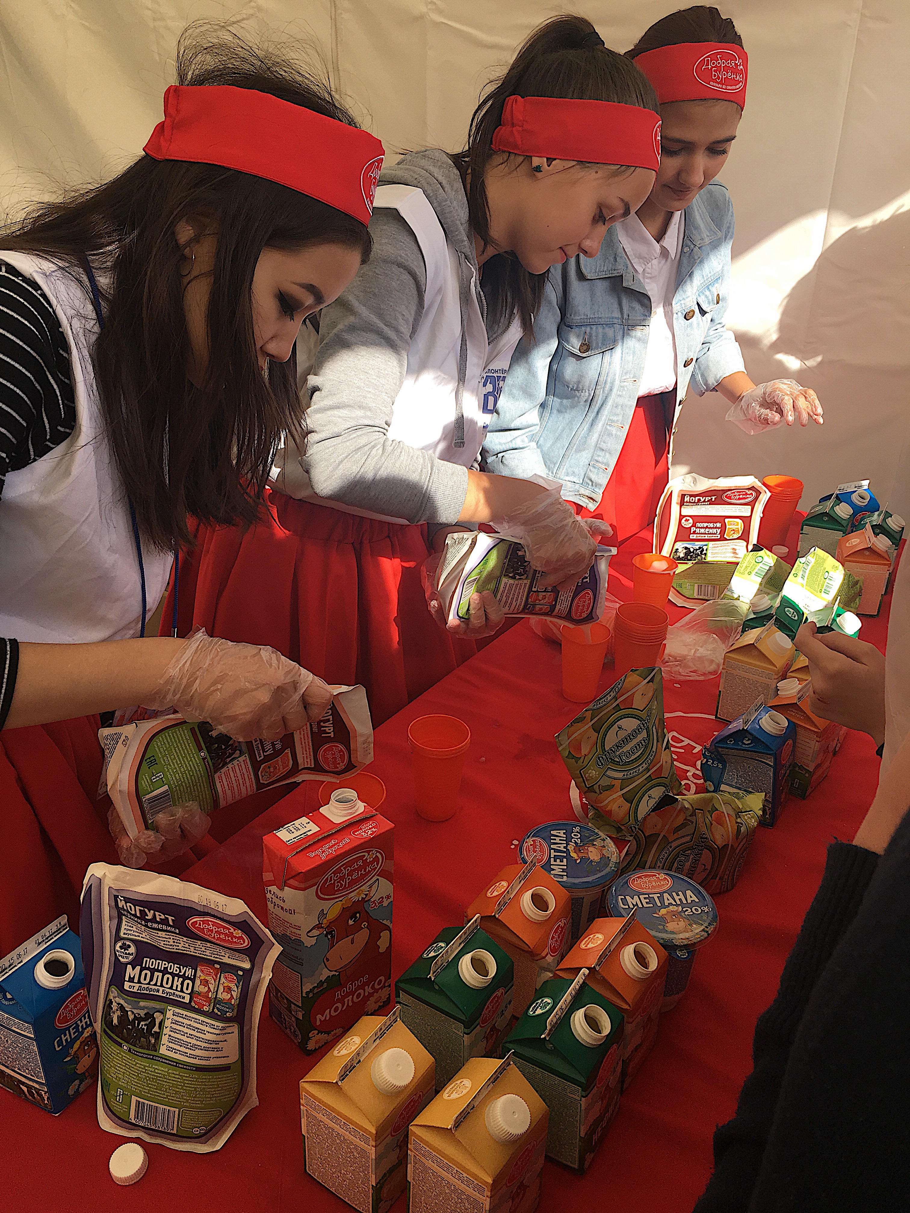 Жителей встречали их добрые друзья - йогурт и молоко от Доброй Бурёнки, а заботливые помощницы предлагали гостям сметанку, кефир, ряженку, йогурты, молоко и многое другое!